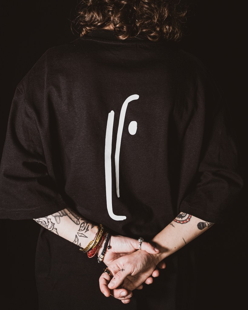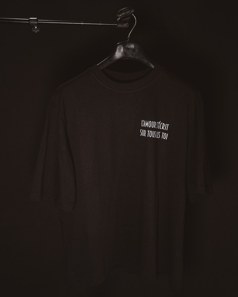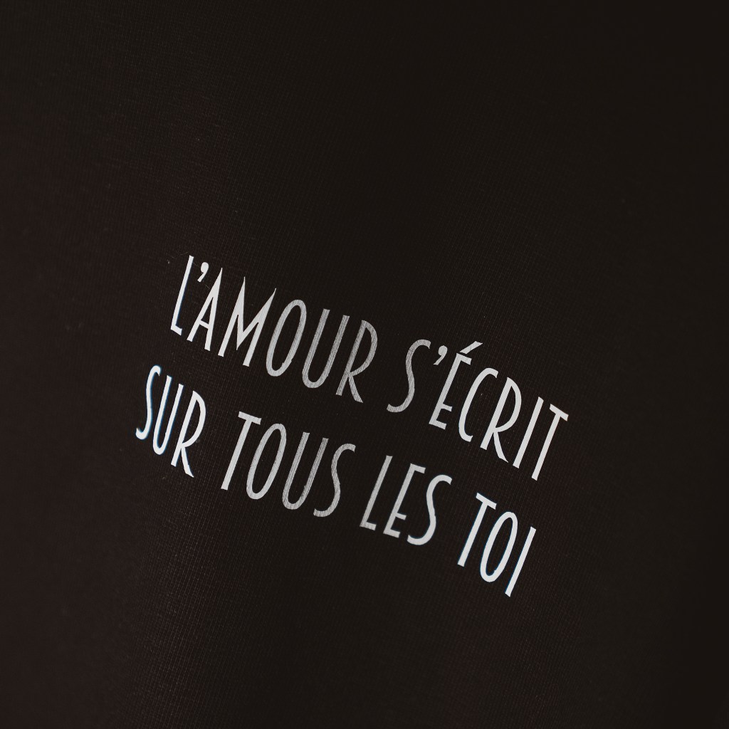 T-shirt noir 100% coton, logo LF + citation : L’amour s’écrit sur tous les toi.