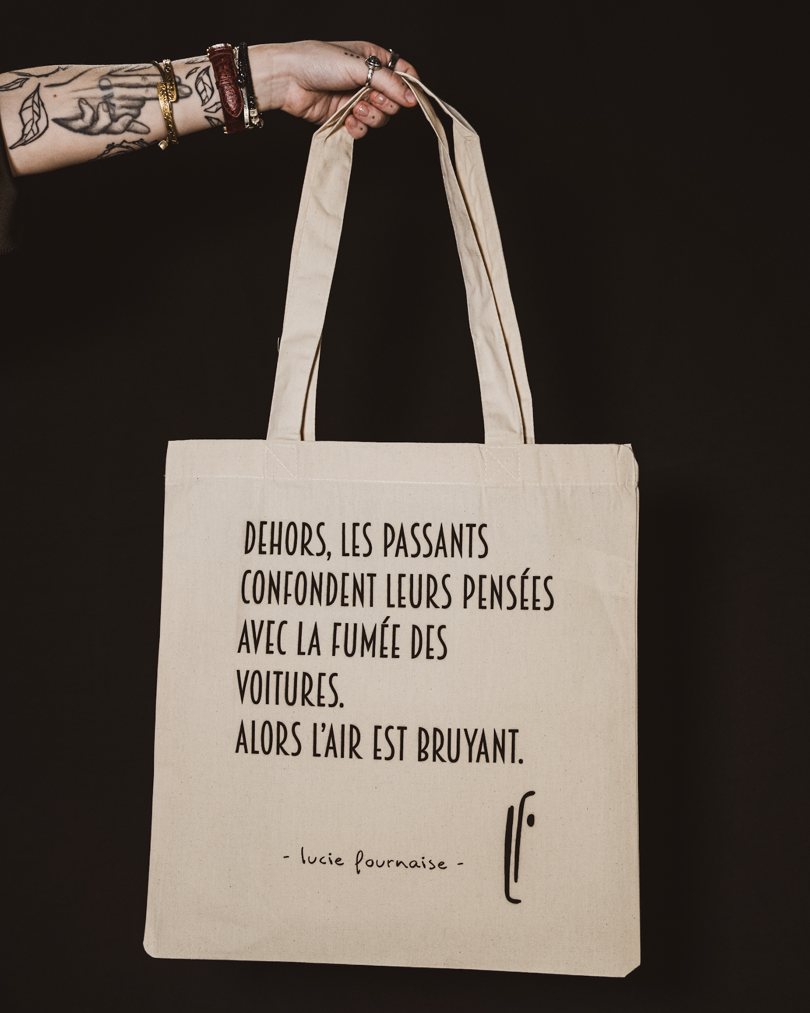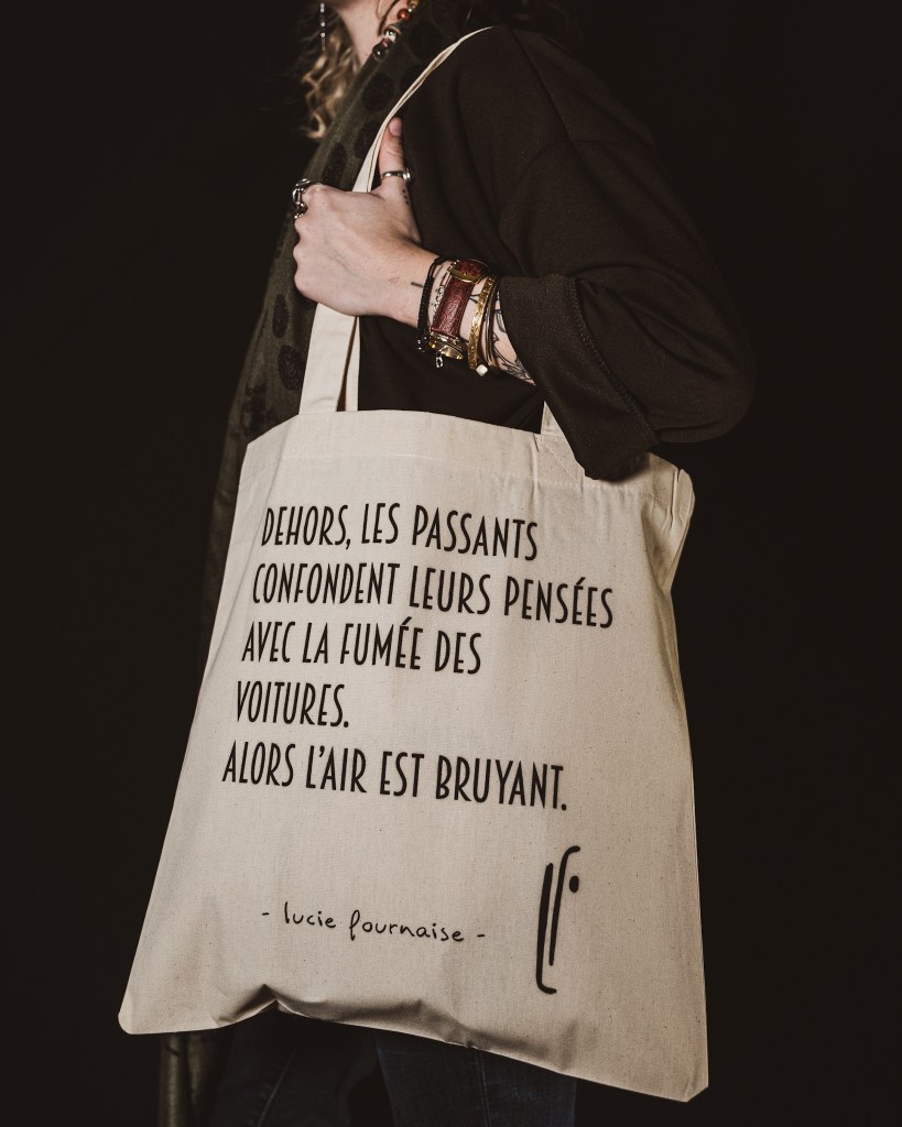 Tote bag en tissu blanc, citation : Dehors, les passants confondent leurs pensées avec la fumée des voitures. Alors l’air est bruyant.